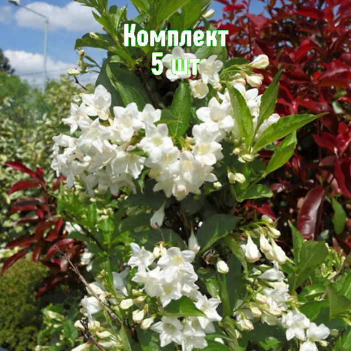 Саженцы вейгелы гибридной Bristol Snowflake — комплект из 5 растений по цене 4. Это декоративный, морозостойкий кустарник с компактной формой (высота до 2 м, диаметр ~1,5 м), ярко‑зеленой листвой до 10 см и белоснежными воронковидными цветками, собранными по 3–5 в полузонтики. Зимостойкость до −28 °C; укрытие обычно требуется только молодым растениям.