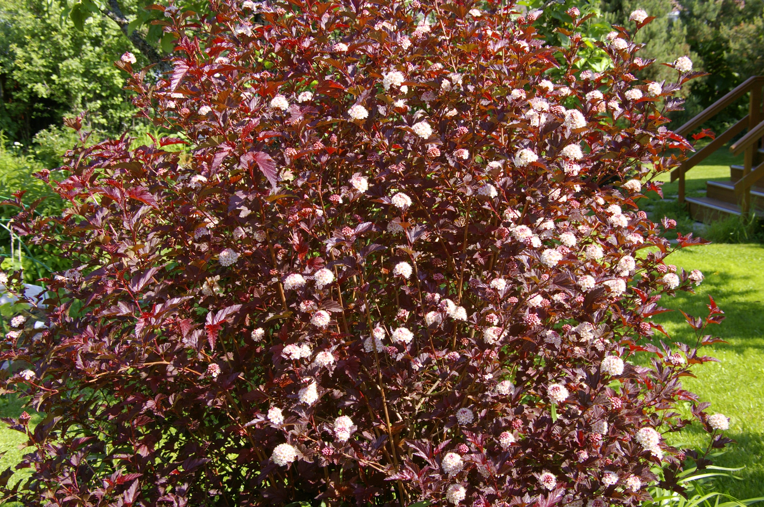 Пузыреплодник калинолистный Леди ин Ред (Physocarpus opulifolius 'Lady in Red') – это великолепный декоративный кустарник, который станет настоящим украшением вашего сада. Его отличительной чертой являются насыщенные бордово-красные листья, которые сохраняют свою яркость на протяжении всего сезона.
