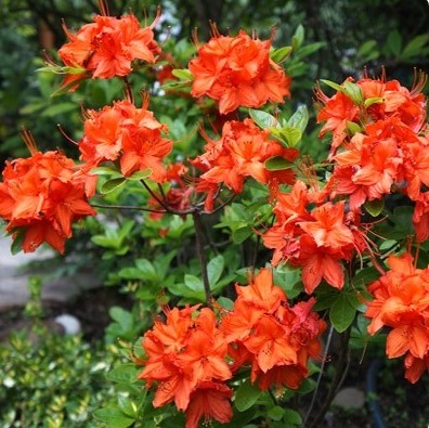 Рододендрон Баккара — гибридный листопадный куст с аккуратной шаровидной кроной. Высота растения составляет 1,2–1,5 м, ширина — до 1–1,2 м. Листья овальные, глянцевые, тёмно‑зелёные. Цветки крупные (6–7 см), насыщенно‑оранжевые с бледно‑жёлтой окантовкой и едва ощутимым ароматом. Период цветения — май–июнь, до 3–4 недель подряд. Сорт морозостойкий и хорошо приживается в садовых композициях.