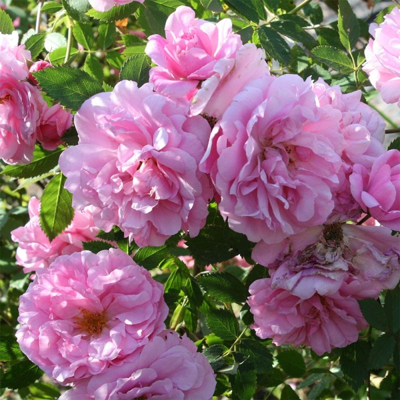 - Цветы: Крупные, махровые, насыщенного розового цвета с легким ароматом.