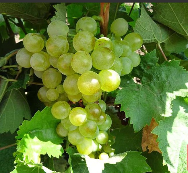 Сорт «Галан» — проверенная временем болгарская культура, внесённая в реестр с конца 1950-х гг. Формирует крупные конические грозди (240–340 г) средней плотности. Плоды округлые, желтовато‑зелёные, с характерным вкусом, по 1–2 семени; лист слегка рассечённый, с умеренным опушением. Срок созревания — среднепоздний, урожайность высокая. Сорт относительной морозостойкости, на зиму требует укрытия.
